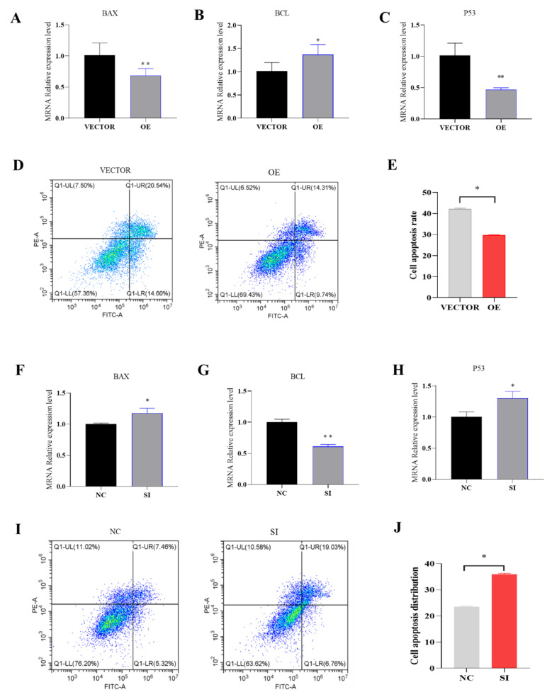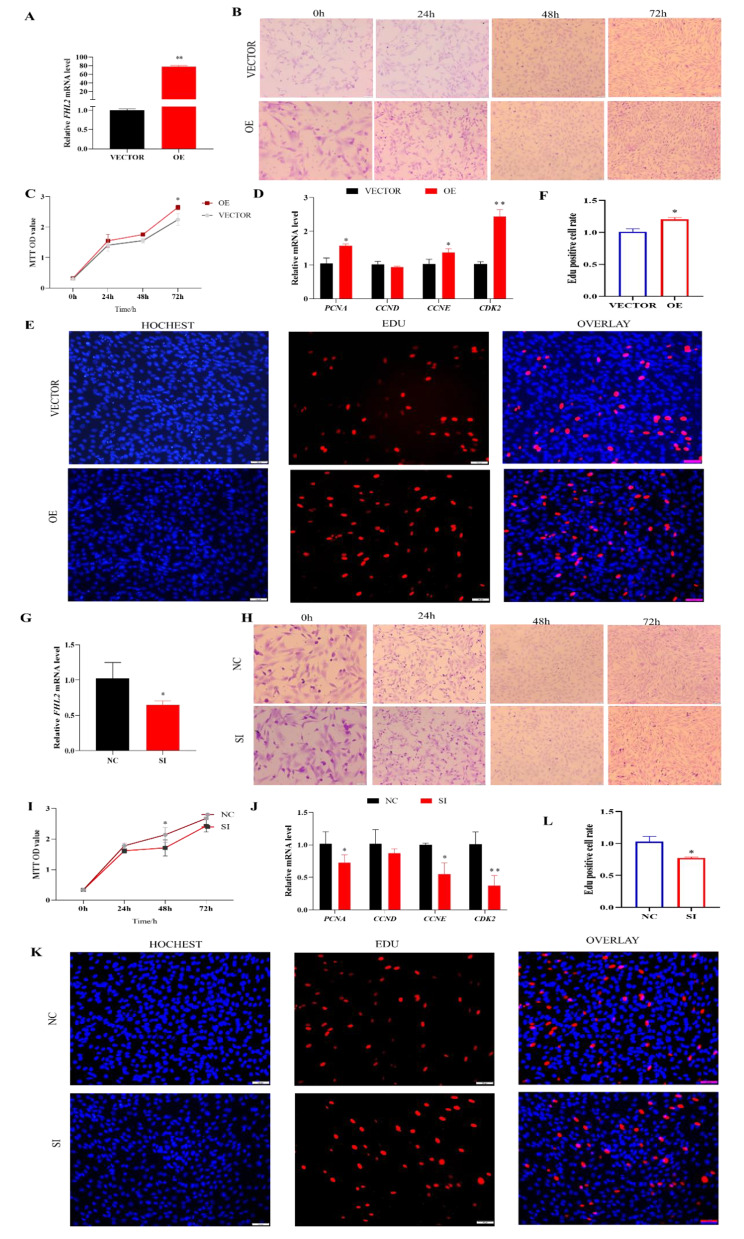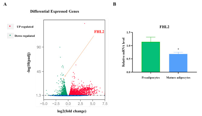 Result: In the transcriptome sequencing analysis of intramuscular adipocytes after three days of differentiation, the differentially expressed gene FHL2 was found. To further explore the biological significance of the differentially expressed gene FHL2, which was downregulated in the mature adipocytes. We revealed the function of FHL2 in adipogenesis through the acquisition and loss of function of FHL2. The results showed that the overexpression of FHL2 significantly increased the expression of adipogenic genes (PPARγ, C/EBPβ) and the differentiation of intramuscular and subcutaneous adipocytes. However, silencing FHL2 significantly inhibited adipocyte differentiation. The overexpression of FHL2 increased the number of adipocytes stained with crystal violet and increased the mRNA expression of proliferation marker genes such as CCNE, PCNA, CCND and CDK2. In addition, it significantly increased the rate of EdU positive cells. In terms of apoptosis, overexpression of FHL2 significantly inhibited the expression of P53 and BAX in both intramuscular and subcutaneous adipocytes, which are involved in cell apoptosis. However, overexpression of FHL2 promoted the expression of BCL, but was rescued by the silencing of FHL2.