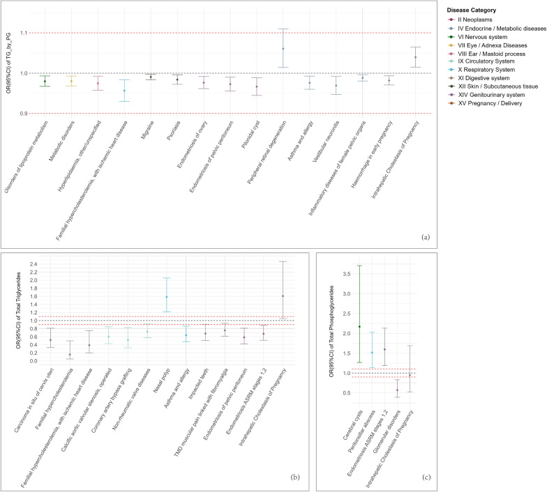 Results: A total of 295 lipid metabolites were included in this study, 29 of them had three or more instrumental variables (IVs) suitable for sensitivity analyses. The ratio of triglycerides to phosphoglycerides (TG_by_PG) was identified as a potential causal biomarker for GDM (inverse variance weighted (IVW) estimate: odds ratio (OR) = 2.147, 95% confidential interval (95% CI) 1.415-3.257, P = 3.26e-4), which was confirmed by validation and reverse MR results. Two other lipid metabolites, palmitoyl sphingomyelin (d18:1/16:0) (PSM(d18:1/16:0)) (IVW estimate: OR = 0.747, 95% CI 0.583-0.956, P = 0.021) and triglycerides in very small very low-density lipoprotein (XS_VLDL_TG) (IVW estimate: OR = 2.948, 95% CI 1.197-5.215, P = 0.015), were identified as suggestive potential biomarkers for GDM using a conventional cut-off P-value of 0.05. Phe-MR results indicated that lowering TG_by_PG had detrimental effects on two diseases but advantageous effects on the other 13 diseases.