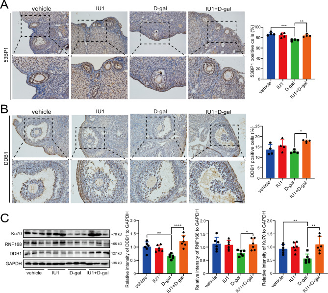 Results: USP14 expression in the granulosa cells of bPOI patients was significantly upregulated. In KGN cells, IU1 treatment and siUSP14 transfection decreased etoposide-induced DNA damage levels, promoted DDR function, and inhibited cell senescence. USP14 overexpression increased DNA damage, impaired DDR function, and promoted cell senescence. Moreover, IU1 treatment and siUSP14 transfection increased nonhomologous end joining (NHEJ), upregulated RNF168, Ku70, and DDB1, and increased ubiquitinated DDB1 levels in KGN cells. Conversely, USP14 overexpression had the opposite effects. Intraperitoneal IU1 injection alleviated etoposide-induced DNA damage in granulosa cells, ameliorated the D-galactose-induced POI phenotype, promoted DDR, and inhibited cell senescence in ovarian granulosa cells in vivo.