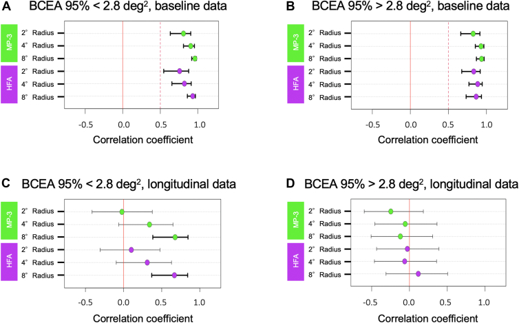 Conclusions: Both MP-3 and HFA values were cross sectionally well-correlated with EZ length in patients with patients; however, these associations became weaker in the longitudinal analysis. This highlights the need for researchers to explore additional or more sensitive parameters to better monitor RP progression.
