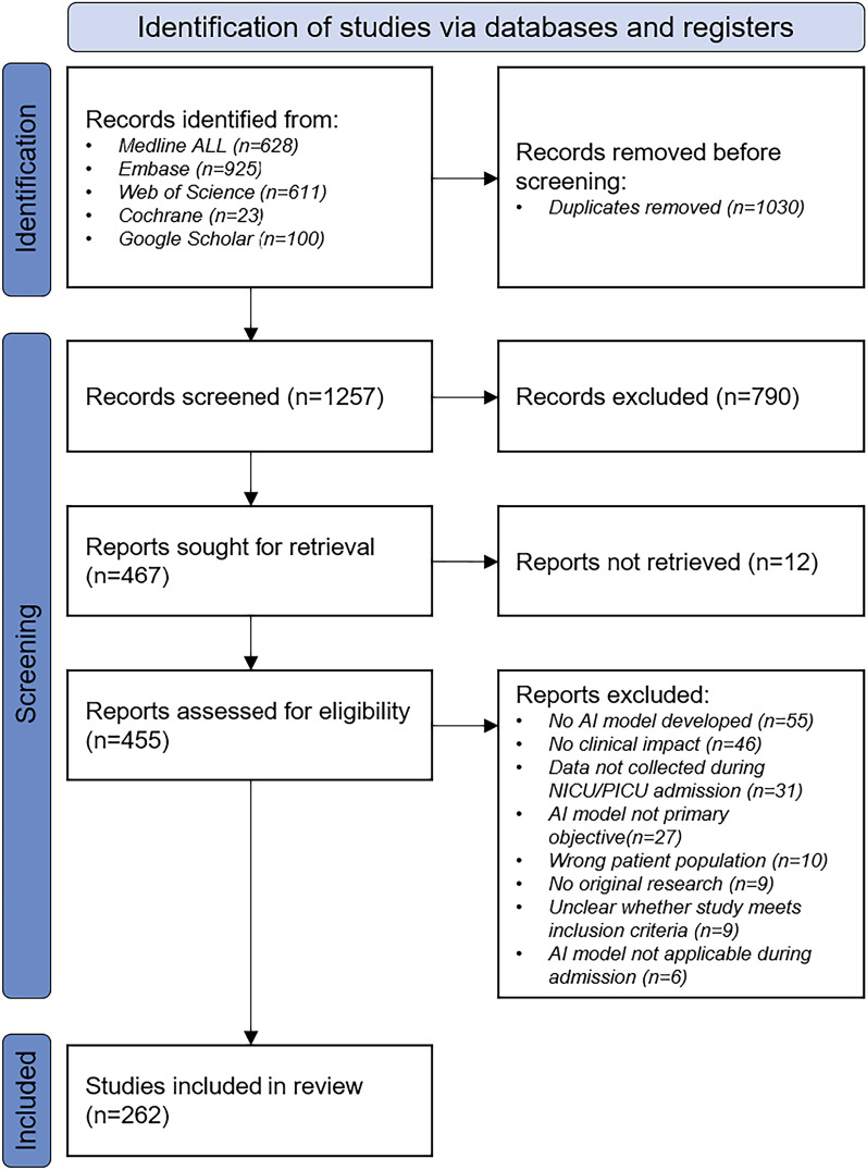 Results: Out of the 1257 identified studies 262 were included. The majority of studies was conducted in the NICU (66%) and most had a high risk of bias (77%). An insufficient sample size was the main cause for this high risk of bias. No studies were identified that integrated an AI model in routine clinical practice and the majority of the studies remained in the prototyping and model development phase.