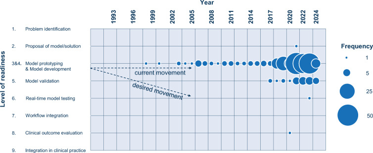 Conclusion: The majority of AI models remain within the testing and prototyping phase and have a high risk of bias. Bridging the gap between designing and clinical implementation of AI models is needed to warrant safe and trustworthy AI models. Specific guidelines and approaches can help improve clinical outcome with usage of AI.
