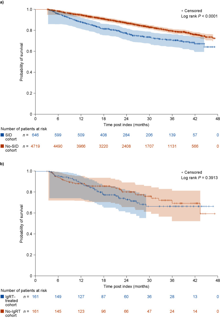 Patients with chronic lymphocytic leukemia/small lymphocytic lymphoma (CLL/SLL) and secondary immunodeficiency disease (SID) are susceptible to severe, recurrent, or persistent infections. This retrospective cohort study assessed the burden of infection in patients with CLL/SLL with and without SID, and in immunoglobulin replacement therapy (IgRT)-treated and -untreated patients with CLL/SLL and SID. Anonymized data from the US Optum-Humedica database (Oct-1-2015-Mar-10-2020) were used. Eligible patients aged ≥ 18 years with a confirmed CLL/SLL diagnosis were assigned to cohorts (SID or no-SID) using an algorithm based on serum IgG levels < 5.0 g/L, hypogammaglobulinemia diagnosis codes, and ≥ 1 major infection. A further sub-categorization was made based on patients with SID who received IgRT and those who did not. During 12-month follow-up, patients with CLL/SLL and SID were significantly more likely to experience infections (70.1% vs. 30.4%), including severe bacterial infections (39.8% vs. 9.2%), and infections requiring hospitalization (27.7% vs. 5.8%) than patients without SID. The use of anti-infectives and healthcare resource utilization (HCRU) was also higher in the SID cohort versus the no-SID cohort. Overall survival was shorter in patients with SID than those without (12.3 vs. 16.9 months). In patients with CLL/SLL and SID, burden of infection and HCRU were greater in IgRT-treated patients than in no-IgRT patients, potentially highlighting the IgRT-treated cohort as a more vulnerable population. Increasing understanding of SID burden may help to improve outcomes in patients with CLL/SLL. Further research is needed to develop guidance for IgRT use and to assess the benefits of IgRT in this vulnerable population.