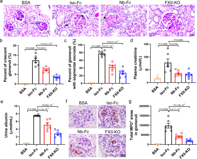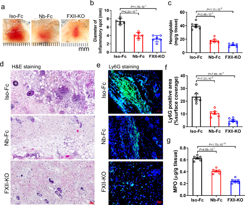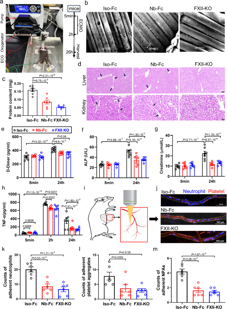 Factor XII (FXII) is the zymogen of the plasma protease FXIIa that activates the intrinsic coagulation pathway and the kallikrein kinin-system. The role of FXII in inflammation has been obscure. Here, we report a single-domain antibody (nanobody, Nb) fused to the Fc region of a human immunoglobulin (Nb-Fc) that recognizes FXII in a conformation-dependent manner and interferes with FXIIa formation. Nb-Fc treatment inhibited arterial thrombosis in male mice without affecting hemostasis. In a mouse model of extracorporeal membrane oxygenation (ECMO), FXII inhibition or knockout reduced thrombus deposition on oxygenator membranes and systemic microvascular thrombi. ECMO increased circulating levels of D-dimer, alkaline phosphatase, creatinine and TNF-α and triggered microvascular neutrophil adherence, platelet aggregation and their interaction, which were substantially attenuated by FXII blockade. Both Nb-Fc treatment and FXII knockout markedly ameliorated immune complex-induced local vasculitis and anti-neutrophil cytoplasmic antibody-induced systemic vasculitis, consistent with selectively suppressed neutrophil migration. In human blood microfluidic analysis, Nb-Fc treatment prevented collagen-induced fibrin deposition and neutrophil adhesion/activation. Thus, FXII is an important mediator of inflammatory responses in vasculitis and ECMO, and Nb-Fc provides a promising approach to alleviate thrombo-inflammatory disorders.