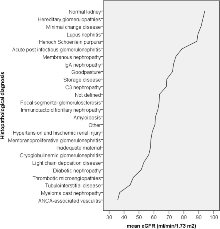 The evaluation of estimated GFR (eGFR) is a pivotal staging step in patients with chronic kidney disease (CKD), and renal ultrasound plays an important role in diagnosis, prognosis and progression of CKD. The interaction between histopathological diagnosis and ultrasound parameters in eGFR determination has not been fully investigated yet. The study examined the results of native kidney biopsies performed in 48 Italian centers between 2012 and 2020. The primary goal was if and how the histopathological diagnosis influences the relationship between ultrasound parameters and eGFR. After exclusion of children, patients with acute kidney injury and patients without measure of kidney length or parenchymal thickness, 2795 patients have been selected for analysis. The median values were 52 years for patient age, 11 cm for bipolar kidney diameter, 16 mm for parenchymal thickness, 2.5 g/day for proteinuria and 70 ml/min/1.73 m2 for eGFR. The bipolar kidney diameter and the parenchymal thickness were directly related with eGFR values (R square 0.064). Diabetes and proteinuria were associated with a consistent reduction of eGFR, improving the adjusted R square up to 0.100. Addition of histopathological diagnosis in the model increased the adjusted R square to 0.216. There is a significant interaction between histopathological diagnosis and longitudinal kidney diameter (P 0.006). Renal bipolar length and parenchymal thickness are directly related with eGFR. The magnitude of proteinuria and histopathological kidney diagnosis are associated with eGFR. The relationship between kidney length and the level of eGFR depends on the nature of the kidney disease.