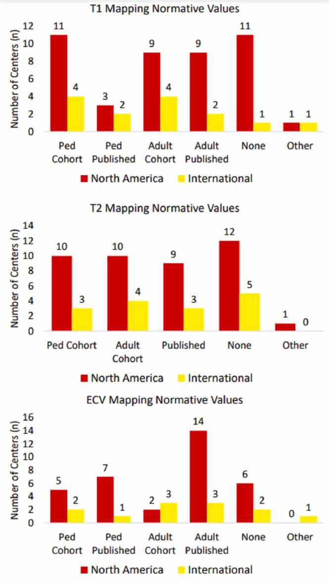 Conclusion: Routine CMR imaging for diagnosis of myocarditis in pediatrics is infrequently performed at surveyed centers despite the focus on a group of non-invasive cardiac imagers. While the majority reported using parametric mapping, few centers reported having pediatric scanner-specific normative data. This highlights an important gap in the utilization of CMR that may aid in the diagnosis of myocardial disease.