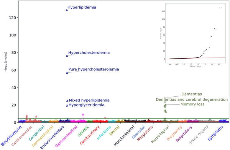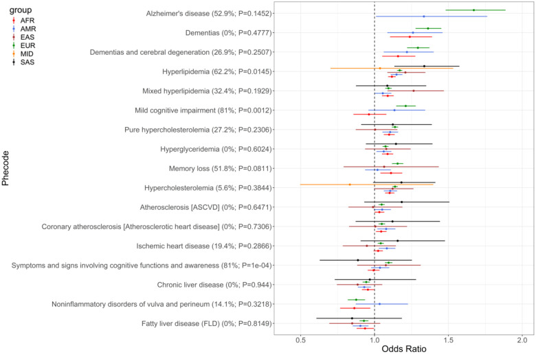 Findings: In the overall cohort, PheWAS identified 17 significant associations, including an increased odds of hyperlipidemia (OR 1.15 [1.14-1.16] per APOE genotype group; P=1.8×10-129), dementia, and Alzheimer's disease (OR 1.55 [1.40-1.70]; P=5×10-19), and a reduced odds of fatty liver disease (OR 0.93 [0.90-0.95]; P=1.6×10-9) and chronic liver disease. ORs were similar after SDOH adjustment and by sex, except for an increased number of cardiovascular associations in males, and decreased odds of noninflammatory disorders of vulva and perineum in females (OR 0.89 [0.84-0.94]; P=1.1×10-5). Significant heterogeneity was observed for hyperlipidemia and mild cognitive impairment across ancestry. Unique associations by ancestry included transient retinal arterial occlusion in the European ancestry group, and first-degree atrioventricular block in the American Admixed/Latino ancestry group.