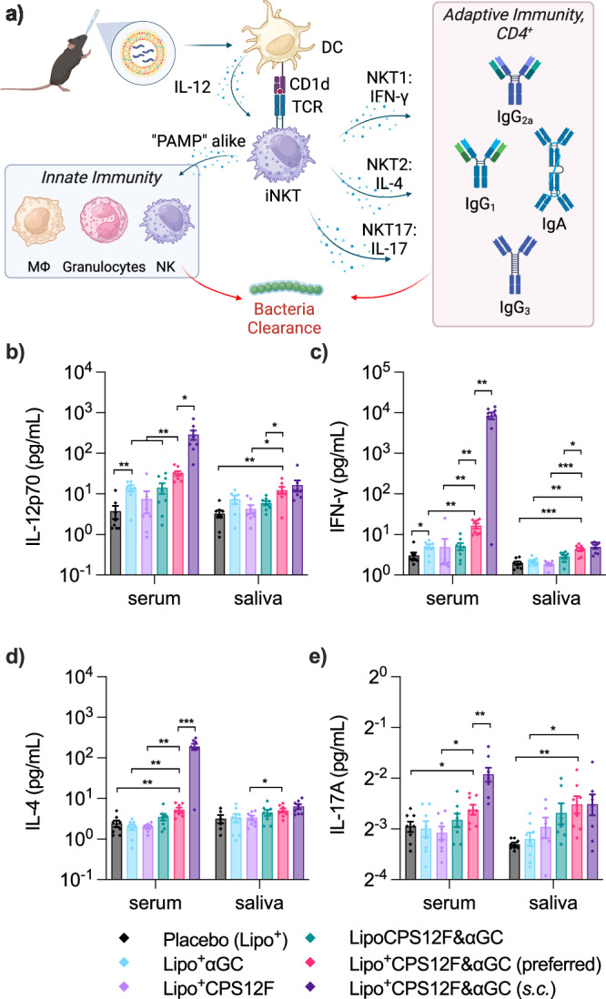 Diseases caused by S. pneumoniae are the leading cause of child mortality. As antibiotic resistance of S. pneumoniae is rising, vaccination remains the most recommended solution. However, the existing pneumococcal polysaccharides vaccine (Pneumovax® 23) proved only to induce T-independent immunity, and strict cold chain dependence of the protein conjugate vaccine impedes its promotion in developing countries, where infections are most problematic. Affordable and efficient vaccines against pneumococcus are therefore in high demand. Here, we present an intranasal vaccine Lipo+CPS12F&αGC, containing the capsular polysaccharides of S. pneumoniae 12F and the iNKT agonist α-galactosylceramide in cationic liposomes. In BALB/cJRj mice, the vaccine effectively activates iNKT cells and promotes B cells maturation, stimulates affinity-matured IgA and IgG production in both the respiratory tract and systemic blood, and displays sufficient protection both in vivo and in vitro. The designed vaccine is a promising, cost-effective solution against pneumococcus, which can be expanded to cover more serotypes and pathogens.