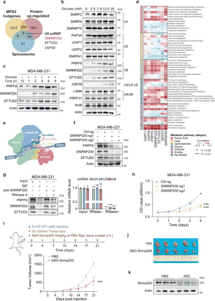 Metabolic dysregulation is prominent in triple-negative breast cancer (TNBC), yet therapeutic strategies targeting cancer metabolism are limited. Here, utilizing multiomics data from our TNBC cohort (n = 465), we demonstrated widespread splicing deregulation and increased spliceosome abundance in the glycolytic TNBC subtype. We identified SNRNP200 as a crucial mediator of glucose-driven metabolic reprogramming. Mechanistically, glucose induces acetylation at SNRNP200 K1610, preventing its proteasomal degradation. Augmented SNRNP200 then facilitates splicing key metabolic enzyme-encoding genes (GAPDH, ALDOA, and GSS), leading to increased lactic acid and glutathione production. Targeting SNRNP200 with antisense oligonucleotide therapy impedes tumor metabolism and enhances the efficacy of anti-PD-1 therapy by activating intratumoral CD8+ T cells while suppressing regulatory T cells. Clinically, higher SNRNP200 levels indicate an inferior response to immunotherapy in glycolytic TNBCs. Overall, our study revealed the intricate interplay between RNA splicing and metabolic dysregulation, suggesting an innovative combination strategy for immunotherapy in glycolytic TNBCs.