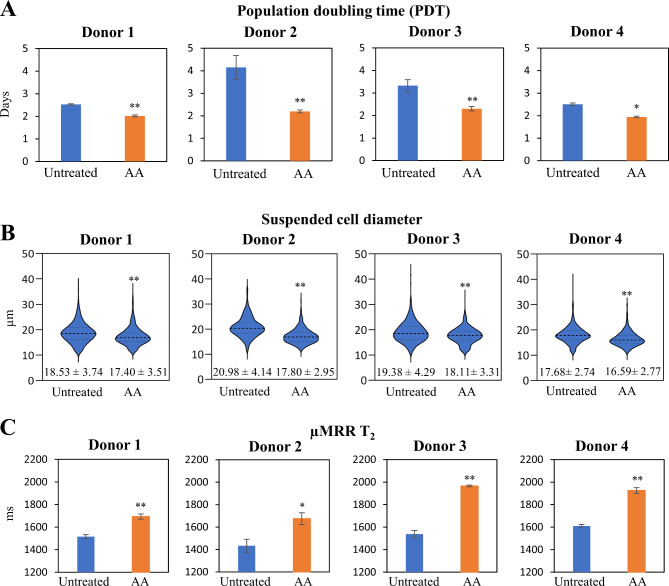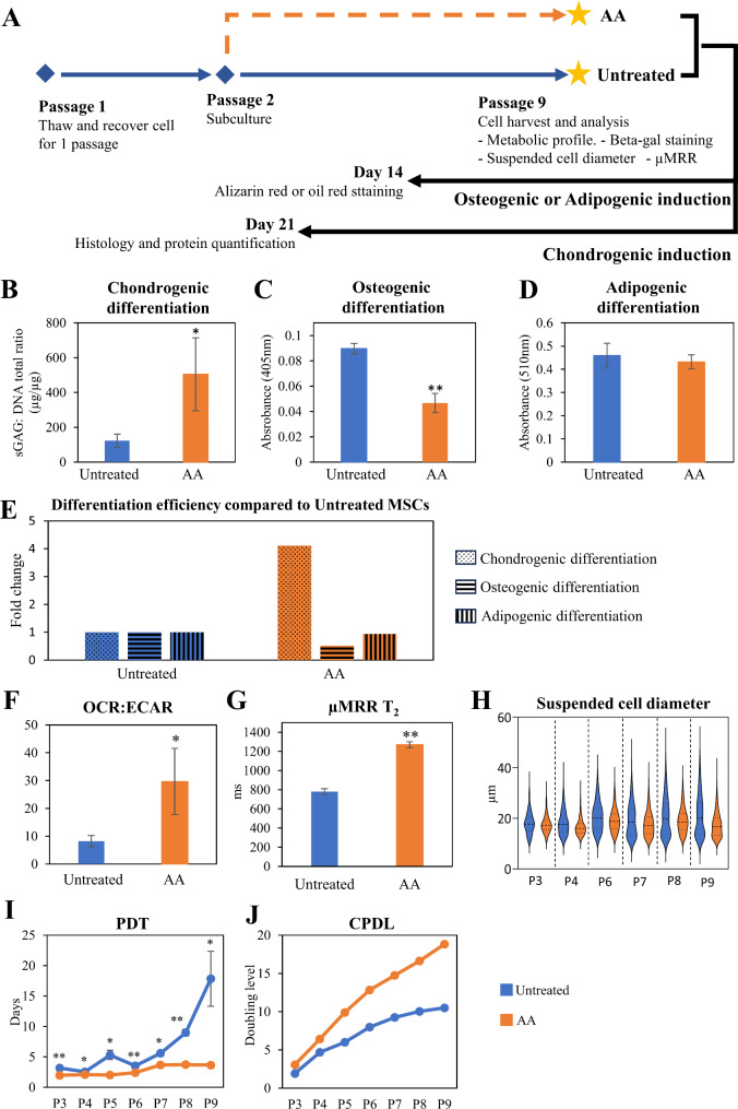 Methods: In this study, we investigated the potential of MSC metabolic modulation during expansion to enhance their chondrogenic commitment by varying the nutrient composition, including glucose, pyruvate, glutamine, and ascorbic acid in culture media. We tested the effect of metabolic modulation in short-term (one passage) and long-term (up to seven passages). We measured metabolic state, cell size, population doubling time, and senescence and employed novel tools including micro-magnetic resonance relaxometry (µMRR) relaxation time (T2) to characterize the effects of AA on improved MSC expansion and chondrogenic potential.