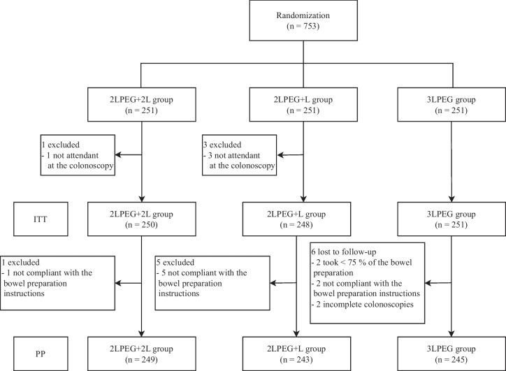 Results: A total of 753 patients were randomly assigned. In ITT analysis, the success of preparation of the 2LPEG + 2L group was better than that of the 2LPEG + L group or the 3LPEG group (92.0% vs. 82.3% vs. 82.1%; P = 0.002). Compared with the 3LPEG group, the 2LPEG + L group showed similar but non-inferior results (82.3% vs. 82.1%, P > 0.05). The 2LPEG + 2L group was similar to the 2LPEG + L group in terms of adverse reaction, tolerance, willingness to reuse, and sleep quality, but both were superior to the 3LPEG group. In a subgroup analysis of chronic constipation, the 2LPEG + 2L group had the best cleansing effect on the right colon and mid colon, while in the subgroup analysis of irritable bowel syndrome, the tolerance was better in the 2LPEG + 2L group and the 2LPEG + L group than the 3LPEG group.