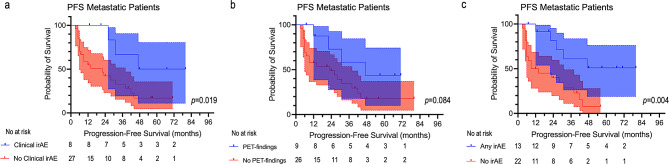 Results: Twenty-one patients showed clinical irAEs only (n = 6), immune-related PET findings only (n = 6), or both (n = 9). In patients whose imaging findings corresponded to clinical irAEs (n = 7), a positive correlation between SUVmax and the severity of the clinical event was observed (rs=0.763, p = 0.046). Clinical irAEs occurred more frequently in patients without macroscopic disease than in metastatic patients (55% vs. 23%, p = 0.039). Patients who developed clinical irAEs had a significantly longer PFS than patients who remained clinically asymptomatic, both in the overall cohort (p = 0.011) and in the subgroup of (n = 35) patients with metastatic disease (p = 0.019). The occurrence of immune-related PET findings significantly stratified PFS in the overall cohort (p = 0.040), and slightly missed statistical significance in patients with metastatic disease (p = 0.08). The best stratification of PFS was achieved when all patients who developed immune-related events, either clinically relevant or detected by PET only, were grouped together both in the overall cohort (p = 0.002) and in patients with metastatic disease (p = 0.004). In the whole sample, OS was longer in patients who developed any immune-related events (p = 0.032).