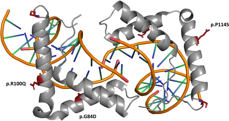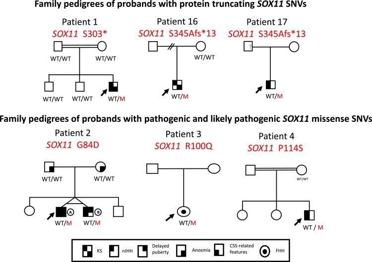 Main outcomes/results: Four pathogenic SOX11 SNVs were identified in 5 IHH probands. The IHH cohort was enriched for SOX11 protein truncating SNVs (frameshift/nonsense) across the entire protein (2 SNVs in 3 IHH cases [p.S303X (de novo); p.S345Afs*13]; P = .0004981) and for SOX11 missense SNVs within the SOX11 high-mobility group domain (2 SNVs in 2 IHH cases p.G84D [de novo]; p.P114S; P = .00313922). The phenotypic spectrum of SOX11 variant carriers revealed additional endocrine defects including anosmic and normosmic forms of IHH, GH deficiency, pituitary and hypothalamic structural defects, and hypothyroidism. A pathogenic SOX11 SNV was also identified in a patient with functional hypogonadotropic hypogonadism (p.R100Q). Coffin-Siris syndrome-associated features were present in 4/5 probands.