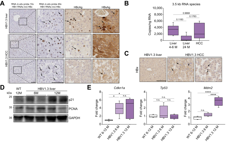 Background & aims: Although most hepatocellular carcinoma (HCC) cases are driven by hepatitis and cirrhosis, a subset of patients with chronic hepatitis B develop HCC in the absence of advanced liver disease, indicating the oncogenic potential of hepatitis B virus (HBV). We investigated the role of HBV transcripts and proteins on HCC development in the absence of inflammation in HBV-transgenic mice.
