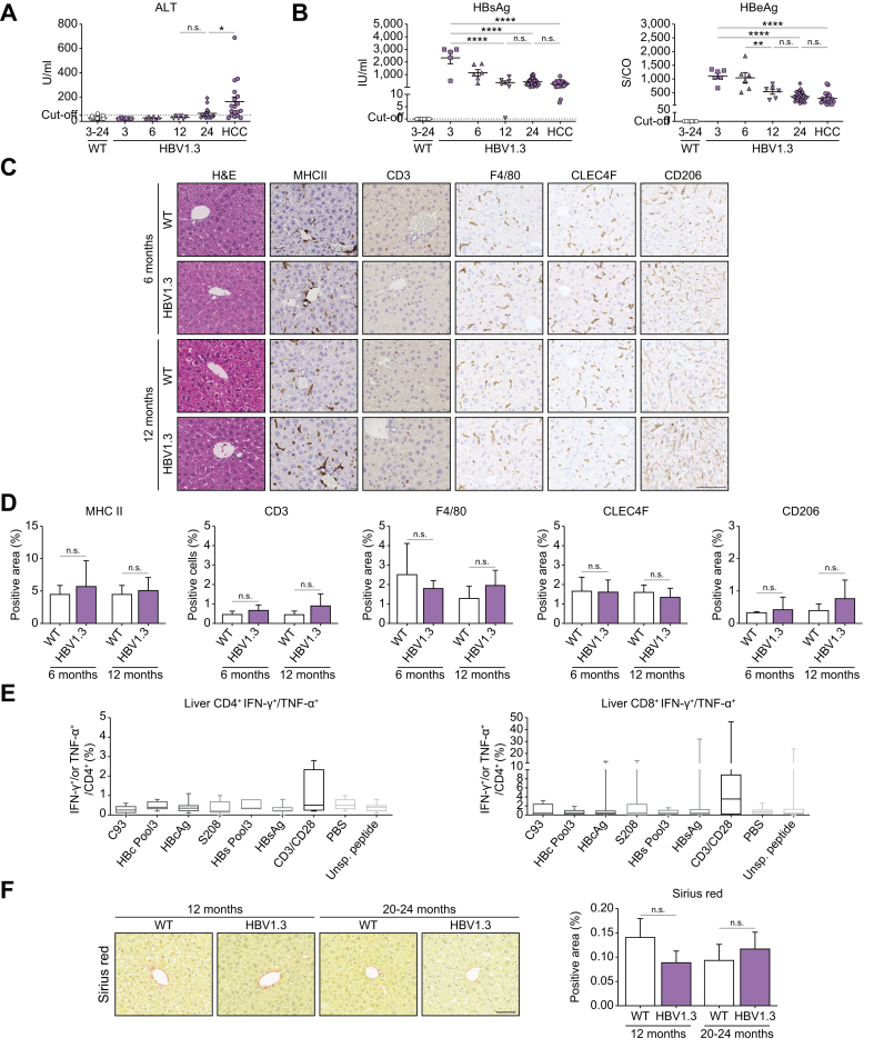 Methods: HBV-transgenic mice replicating HBV and expressing all HBV proteins from a single integrated 1.3-fold HBV genome in the presence or absence of wild-type HBx (HBV1.3/HBVxfs) were analyzed. Flow cytometry, molecular, histological and in vitro analyses using human cell lines were performed. Hepatocyte-specific Stat3- and Socs3-knockout was analyzed in HBV1.3 mice.