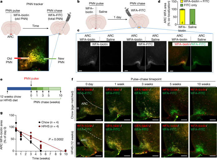 Metabolic diseases such as obesity and type 2 diabetes are marked by insulin resistance1,2. Cells within the arcuate nucleus of the hypothalamus (ARC), which are crucial for regulating metabolism, become insulin resistant during the progression of metabolic disease3-8, but these mechanisms are not fully understood. Here we investigated the role of a specialized chondroitin sulfate proteoglycan extracellular matrix, termed a perineuronal net, which surrounds ARC neurons. In metabolic disease, the perineuronal net of the ARC becomes augmented and remodelled, driving insulin resistance and metabolic dysfunction. Disruption of the perineuronal net in obese mice, either enzymatically or with small molecules, improves insulin access to the brain, reversing neuronal insulin resistance and enhancing metabolic health. Our findings identify ARC extracellular matrix remodelling as a fundamental mechanism driving metabolic diseases.