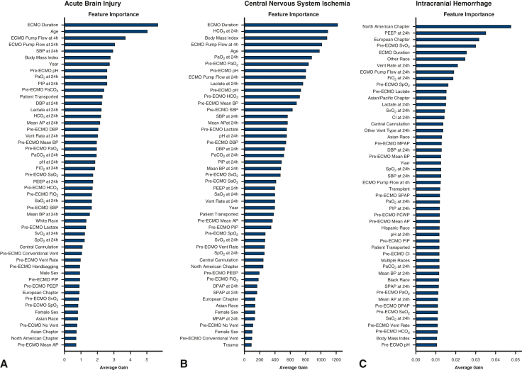 Methods: We included adults (age ≥18 years) receiving venoarterial extracorporeal membrane oxygenation or extracorporeal cardiopulmonary resuscitation in the Extracorporeal Life Support Organization Registry (2009-2021). Our primary outcome was acute brain injury: central nervous system ischemia, intracranial hemorrhage, brain death, and seizures. We used Random Forest, CatBoost, LightGBM, and XGBoost machine learning algorithms (10-fold leave-1-out cross-validation) to predict and identify features most important for acute brain injury. We extracted 65 total features: demographics, pre-extracorporeal membrane oxygenation/on-extracorporeal membrane oxygenation laboratory values, and pre-extracorporeal membrane oxygenation/on-extracorporeal membrane oxygenation settings.