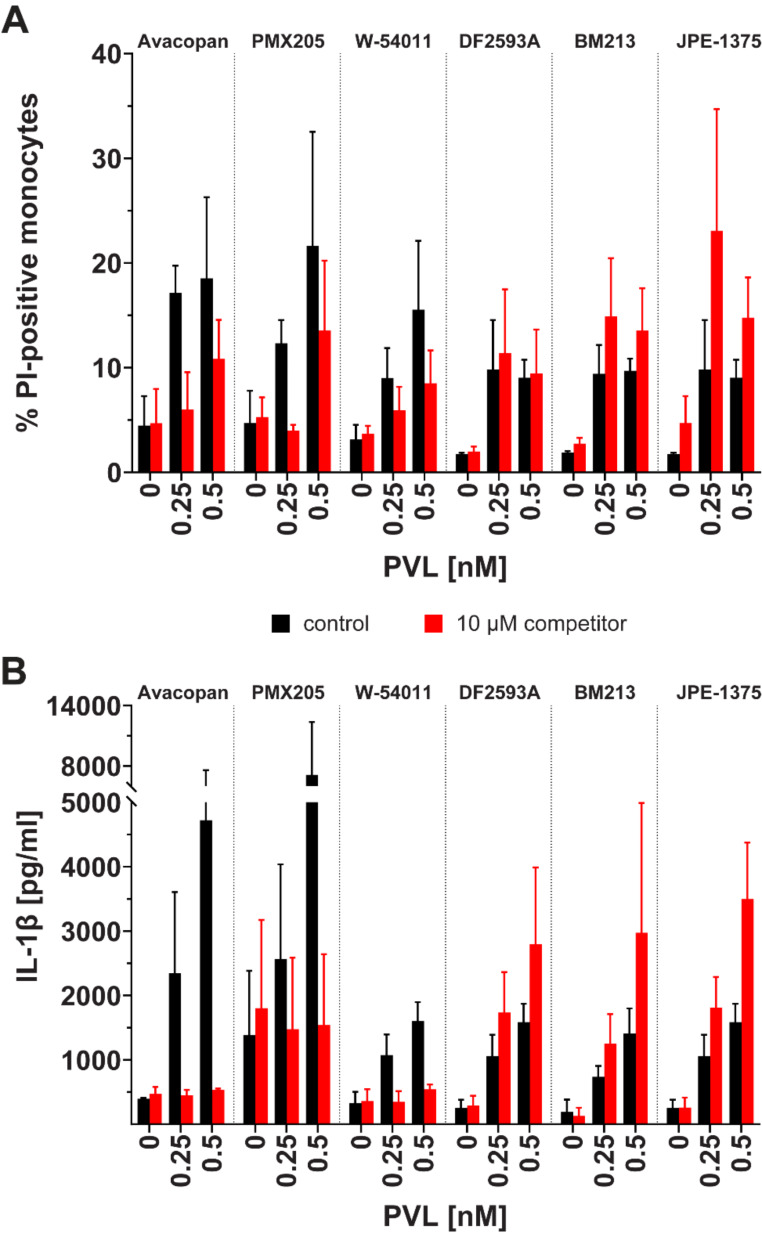 The Panton-Valentine leukocidin (PVL) of Staphylococcus aureus is associated with necrotizing infections. After binding to complement 5a receptor (C5aR/CD88) and CD45 it causes cytolysis in polymorphonuclear neutrophils (PMNs) as well as inflammasome activation in monocytes. The objective of this study was to test if (ant)agonists of C5aR and CD45 can attenuate the effect of PVL on PMNs and monocytes. We tested the effect of various concentrations of six C5aR (ant)agonists (avacopan, BM213, DF2593A, JPE-1375, PMX205 and W-54011) and one CD45 antagonist (NQ301) to attenuate the cytotoxic effect of PVL on human PMNs and monocytes in vitro. Shifts in the half-maximal effective concentration (EC50) of PVL to achieve a cytotoxic effect on PMNs and modulation of inflammatory cytokine response from monocytes were determined by flow cytometry and IL-1β detection. Pre-treatment of PMNs with avacopan, PMX205 and W-54,011 resulted in 3.6- to 4.3-fold shifts in the EC50 for PVL and were able to suppress IL-1β secretion by human monocytes in the presence of PVL. BM213, DF2593A and NQ301 were unable to change the susceptibility of PMNs towards PVL or reduce inflammasome activation in monocytes. Avacopan, PMX205 and W-54,011 showed protection against PVL-induced cytotoxicity and suppressed IL-1β secretion by monocytes. Clinical studies are needed to prove whether these substances can be used therapeutically as repurposed drugs.