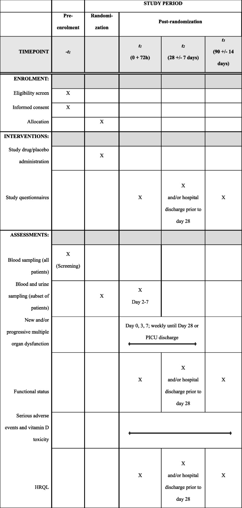 Methods: Our aim is to evaluate the impact of this dosing regimen on clinical outcomes. VITdALIZE-KIDS is a pragmatic, phase III, multicenter, double-blind RCT aiming to randomize 766 critically ill children from Canadian PICUs. Participants are randomized using a 1:1 scheme to receive a single dose at enrollment of enteral cholecalciferol (10,000 IU/kg, max 400,000 IU) or placebo. Eligibility criteria include critically ill children aged newborn (> 37 weeks corrected gestational age) to < 18 years who have blood total 25-hydroxyvitamin D < 50 nmol/L. The primary objective is to determine if rapid normalization of vitamin D status improves HRQL at 28 days following enrollment. The secondary objective is to evaluate the impact of rapid normalization of vitamin D status on multiple organ dysfunction. The study includes additional tertiary outcomes including functional status, HRQL and mortality at hospital discharge and 90 days, PICU and hospital length of stay, and adverse events related to vitamin D toxicity. Additionally, we are performing comprehensive vitamin D speciation and non-targeted metabolite profiling as part of a sub-study for the first 100 participants from whom an enrollment and at least one post-intervention blood and urine sample were obtained.