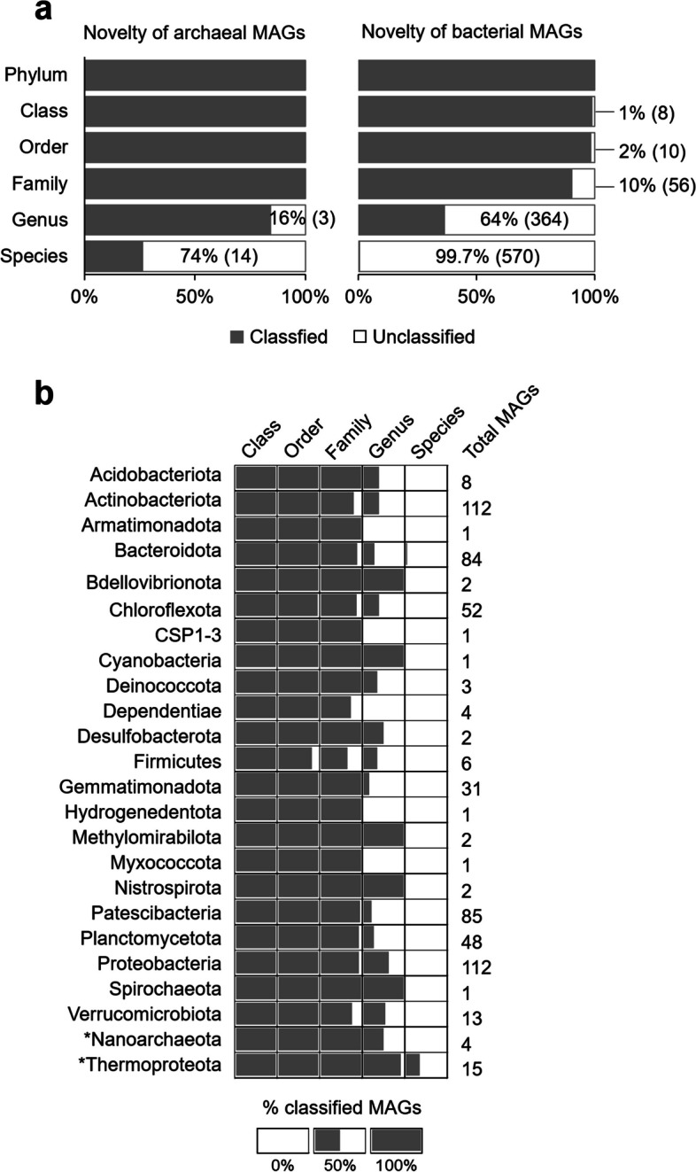 Conclusions: The high number of novel bacterial and archaeal MAGs in the Laguna Lejía indicates the wide prokaryotic diversity discovered. In addition, the detection of genes in unexpected taxonomic groups has significant implications for the expansion of microorganisms involved in the biogeochemical cycles of carbon, nitrogen, and sulfur. Video Abstract.