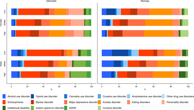 Background: Findings from the Global Burden of Disease (GBD) study have shown that the burden of mental and substance use disorders is considerable, and unevenly distributed across demographic groups in the population. However, there is a lack of knowledge on how this burden differs by socioeconomic position. The aim of this study was to examine educational differences in years lived with disability (YLDs) from mental and substance use disorders among males and females in two high-income countries, taking comorbidity with other diseases into account.