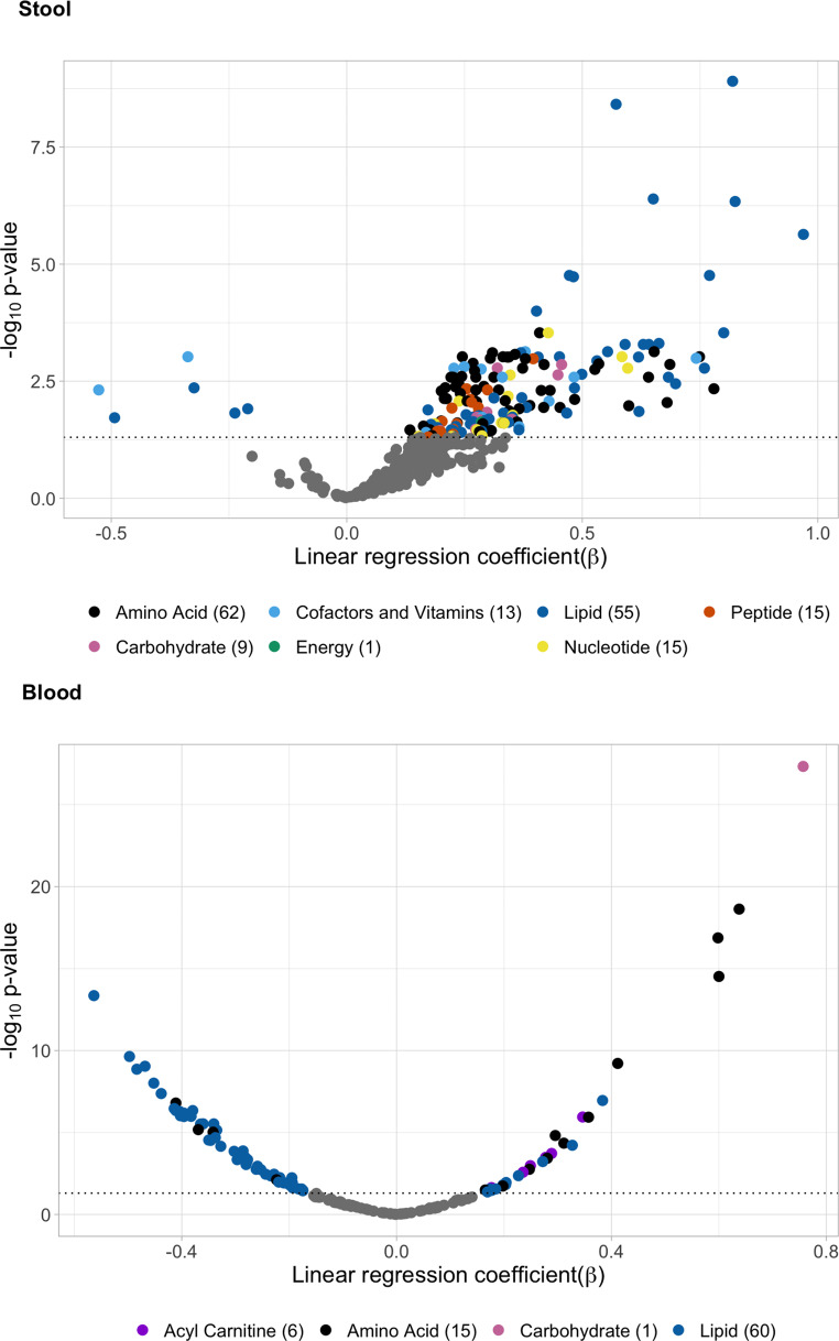 Conclusions: The MetS, particularly dyslipidemia, is associated with multiple stool and blood metabolites that are also associated with systemic inflammation. Further studies are necessary to validate our findings and to characterize metabolic alterations in the MetS. Although our analyses point to weak correlations between stool and blood metabolites, additional studies using integrative approaches are warranted.