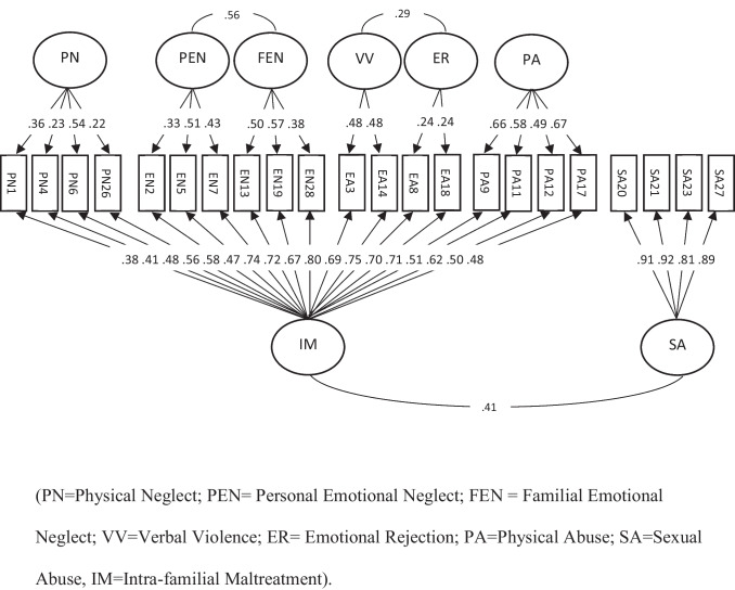 The Childhood Trauma Questionnaire-Short Form (CTQ-SF) is a widely used and standardized questionnaire designed to assess five types of childhood abuse. Despite the fact that the CTQ-SF demonstrates good validity and reliability, its internal structure presents some limitations and its original 28-item five-factor model has been contested. The present study assesses the reliability and the factor structure of a French version of the CTQ-SF for an alternative 25-item model and a bifactorial model, using confirmatory factor analysis (CFA). Participants were French-speaking females from two independent samples (N = 1903, N = 690). They completed an online sociodemographic questionnaire and the online version of the CTQ-SF. The new model proposed in this article demonstrated excellent fit indices in two independent samples. Our results support the fit of a bifactorial 25-item model, suggesting the presence of a general factor of intrafamilial maltreatment, from which only sexual abuse would be separated. Furthermore, the results support the fit of a solution with seven factors. This research proposes alternative models that address the limitations pinpointed by previous international studies and demonstrate good fit indices. Moreover, these findings provide support for the validity of a French version of the CTQ-SF.