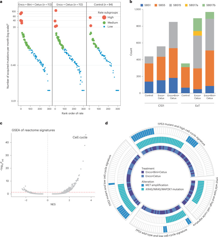 The BEACON CRC study demonstrated that encorafenib (Enco)+cetuximab (Cetux)±binimetinib (Bini) significantly improved overall survival (OS) versus Cetux + chemotherapy in previously treated patients with BRAF-V600E-mutant mCRC, providing the basis for the approval of the Enco+Cetux regimen in the United States and the European Union. A greater understanding of biomarkers predictive of response to Enco+Cetux±Bini treatment is of clinical relevance. In this prespecified, exploratory biomarker analysis of the BEACON CRC study, we characterize genomic and transcriptomic correlates of clinical outcomes and acquired resistance mechanisms through integrated clinical and molecular analysis, including whole-exome and -transcriptome tissue sequencing and circulating tumor DNA genomic profiling. Tumors with higher immune signatures showed a trend towards increased OS benefit with Enco+Bini+Cetux. RAS, MAP2K1 and MET alterations were most commonly acquired with Enco+Cetux±Bini, and more frequent in patients with a high baseline cell-cycle gene signature; baseline TP53 mutation was associated with acquired MET amplification. Acquired mutations were subclonal and polyclonal, with evidence of increased tumor mutation rate with Enco+Cetux±Bini and mutational signatures (SBS17a/b). These findings support treatment with Enco+Cetux±Bini for patients with BRAF-V600E-mutant mCRC and provide insights into the biology of response and resistance to MAPK-pathway-targeted therapy. ClinicalTrials.gov registration: NCT02928224.