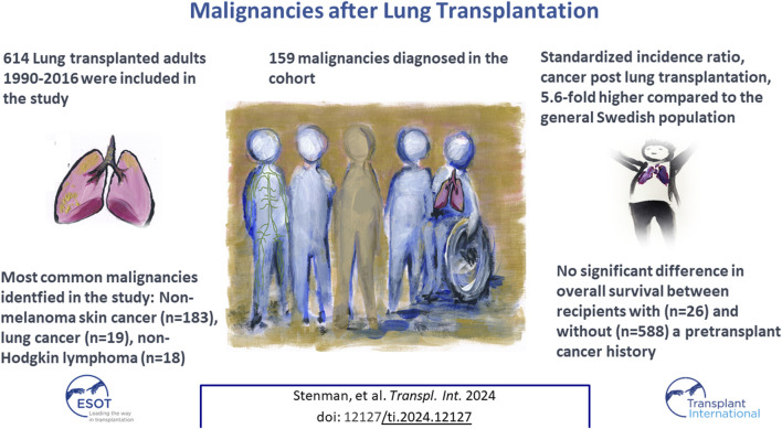 Lung transplantation (LTx) is a well-known treatment for end-stage lung disease. This study aimed to report the incidence of cancer after LTx and long-term outcome among lung transplant recipients with a pretransplant diagnosis of cancer. Patients who underwent LTx between 1990-2016 were included in the study. Detection of cancer was obtained by cross-checking the study population with the Swedish Cancer Registry and the Cause-of-Death registry. A total of 614 patients were followed for a median of 5.1 years. In all, 159 malignancies were diagnosed. The excess risk of cancer or standardized incidence ratio (SIR) following LTx was 5.6-fold compared to the general Swedish population. The most common malignancies were non-melanoma skin cancer (NMSC) (SIR 76.5 (95%CI 61.7-94.8); non-Hodgkin lymphoma (SIR 23.5, 95%CI 14.8-37.2); and lung cancer (SIR 8.89, 95%CI 5.67-13.9). There was no significant difference in overall survival between those with and without a history of cancer before LTx (p = 0.56). In total, 159 malignancies were identified after LTx, which was a 5.6-fold higher relative to the general population. A history of previous cancer yields similar survival in selected recipients, compared to those without cancer prior to LTx.