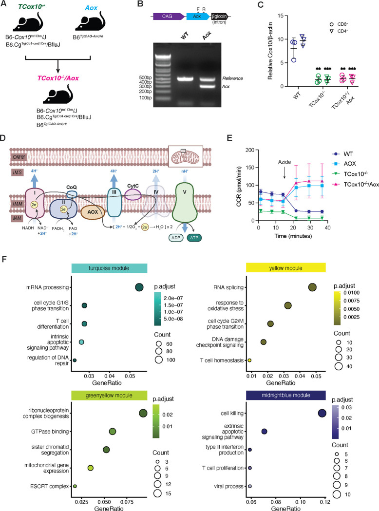 T cell activation, proliferation, and differentiation are fundamentally driven by shifts in cellular metabolism, with mitochondria playing a central role. Cytochrome c oxidase (COX, complex IV) is a key player in this process, as its activity is crucial for apoptosis, mtDNA maintenance, mitochondrial transcription, and mitochondrial respiration (MR), all of which influence T cell fate and function. Despite its known roles, the specific functions of COX required for T cell activity in vivo remain unclear. To isolate the role of MR in T cell function, we reintroduced this capability in COX-deficient T cells using an alternative oxidase (AOX) from Ciona intestinalis. Our findings demonstrate that MR is vital for maintaining metabolic balance during T cell activation by alleviating electron pressure from metabolic reprogramming and preserving redox homeostasis. We further showed that AOX mitigates apoptosis, prevents metabolic disruptions in glycolysis and the tricarboxylic acid cycle, and improves mtDNA maintenance and transcription, indicating that these disturbances are secondary to impaired MR in the absence of COX. Most importantly, the introduction of AOX restored robust effector and memory T cell generation and function in COX-deficient cells. These results highlight the essential role of COX-dependent MR in ensuring cellular health and underscore its pivotal role in T cell proliferation and differentiation.