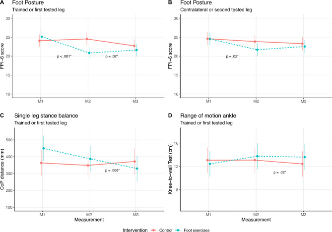 This study investigated the local, remote, and contralateral effects of a four-week intrinsic foot muscle exercise intervention in recreationally active participants on foot parameters, flexibility, and performance of the posterior chain (PC). Twenty-eight healthy participants (12f, 16m) were randomly assigned to a control group or performed 2 × 6 min of foot exercises twice daily unilaterally at least five days/week for four weeks. At baseline (M1), after the intervention (M2), and after a four-week wash-out period (M3), we assessed bilateral Foot Posture Index-6, medial longitudinal arch mobility, single-leg stance balance, range of motion (ROM) (first metatarsophalangeal joint and ankle), and flexibility and performance of the PC. The FPI-6 score changes over time differed significantly between groups for both legs, improving by 26% in the trained- (p < .001) and 11% in the untrained leg (p = .02) in the intervention group from M1 to M2. Improvements were maintained at M3 for the trained leg (p = .02). Ankle range of motion and balance of the trained leg improved from M1 to M2, yet only became significant at M3 (ROM: p = .02; balance: p = .007). The other parameters did not change significantly. A four-week foot exercise intervention might have local but no remote effects in healthy young adults.German Clinical Trial Register (DRKS00027923) (24/08/2022).
