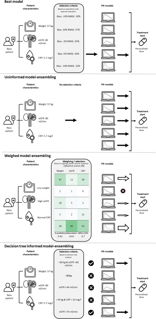 Methods: PK data and models describing both hospitalized patients (n = 134) receiving continuous vancomycin (26 models) and patients (n = 92) receiving imatinib in an outpatient setting (12 models) are included. Target attainment of four model-selection methods was compared with standard dosing: the best model based on external validation, uninformed model ensembling, model ensembling using a weighting scheme on the basis of covariate-stratified external evaluation, and model selection using covariates in decision trees that were subsequently ensembled.