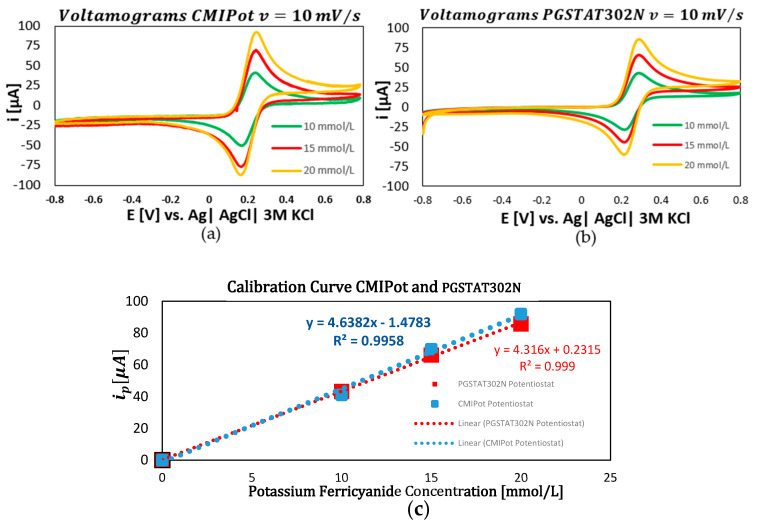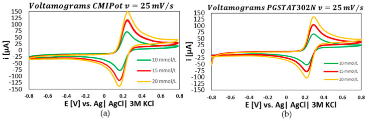 This work presents a novel compact CMOS potentiostat-designed circuit for an electrochemical cell. The proposed topology functions as a circuit interface, controlling the polarization of voltage signals at the sensor electrodes and facilitating current measurement during the oxidation-reduction process of an analyzed solution. The potentiostat, designed for CMOS technology, comprises a two-stage amplifier, two current mirror blocks coupled to this amplifier, and a CMOS push-pull output stage. The electrochemical method of cyclic voltammetry is employed, operating within a voltage range of ±0.8 V and scan rates of 10 mV/s, 25 mV/s, 100 mV/s, and 250 mV/s. The circuit is capable of reading currents ranging from 10 µA to 500 µA. Experimental results were obtained using a potassium ferrocyanide K3[Fe(CN)6] redox solution with concentrations of 10, 15, and 20 mmol/L, and their corresponding voltammograms were evaluated. The experimental results from a discrete circuit demonstrate that the proposed potentiostat topology produces outcomes consistent with those of classical topologies presented in the literature and industrial equipment.