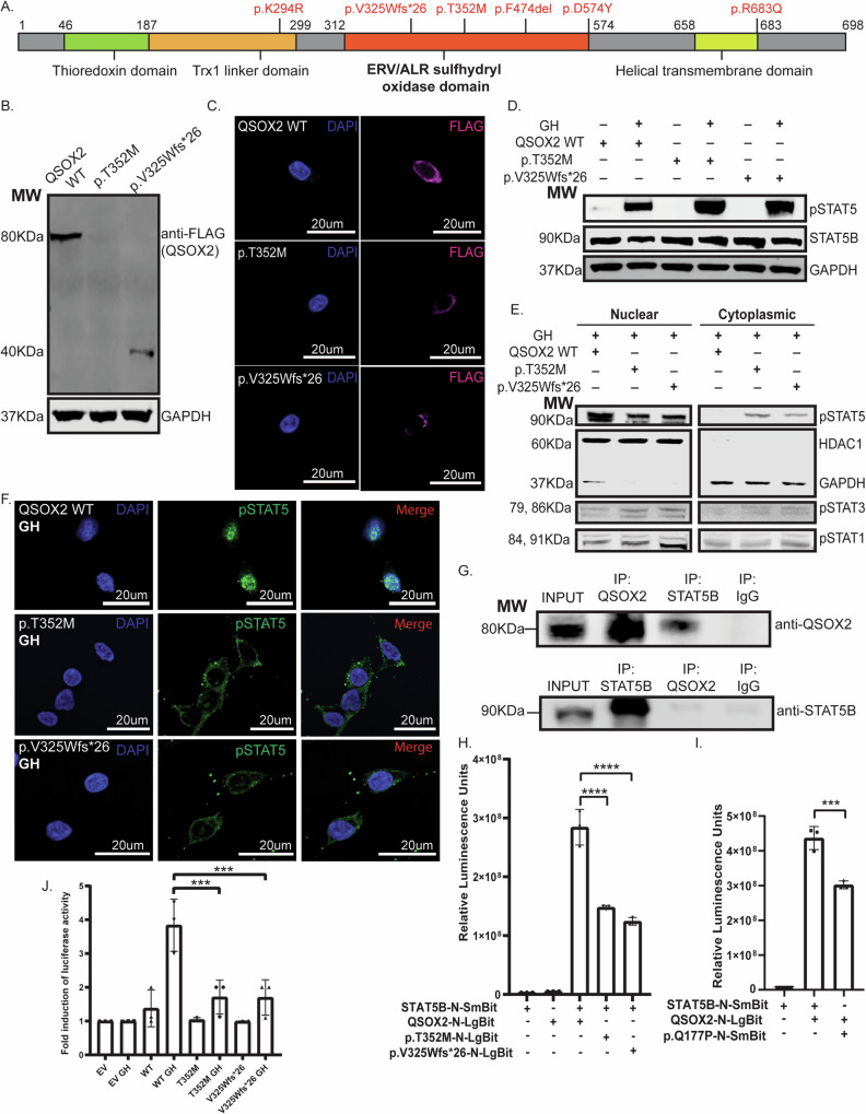 Postnatal growth failure is often attributed to dysregulated somatotropin action, however marked genetic and phenotypic heterogeneity exist. We report five patients from three families who present with short stature, immune dysfunction, atopic eczema and gastrointestinal pathology associated with recessive variants in QSOX2. QSOX2 encodes a nuclear membrane protein linked to disulphide isomerase and oxidoreductase activity. Loss of QSOX2 disrupts Growth hormone-mediated STAT5B nuclear translocation despite enhanced Growth hormone-induced STAT5B phosphorylation. Moreover, patient-derived dermal fibroblasts demonstrate Growth hormone-induced mitochondriopathy and reduced mitochondrial membrane potential. Located at the nuclear membrane, QSOX2 acts as a gatekeeper for regulating stabilisation and import of phosphorylated-STAT5B. Altogether, QSOX2 deficiency modulates human growth by impairing Growth hormone-STAT5B downstream activities and mitochondrial dynamics, which contribute to multi-system dysfunction. Furthermore, our work suggests that therapeutic recombinant insulin-like growth factor-1 may circumvent the Growth hormone-STAT5B dysregulation induced by pathological QSOX2 variants and potentially alleviate organ specific disease.