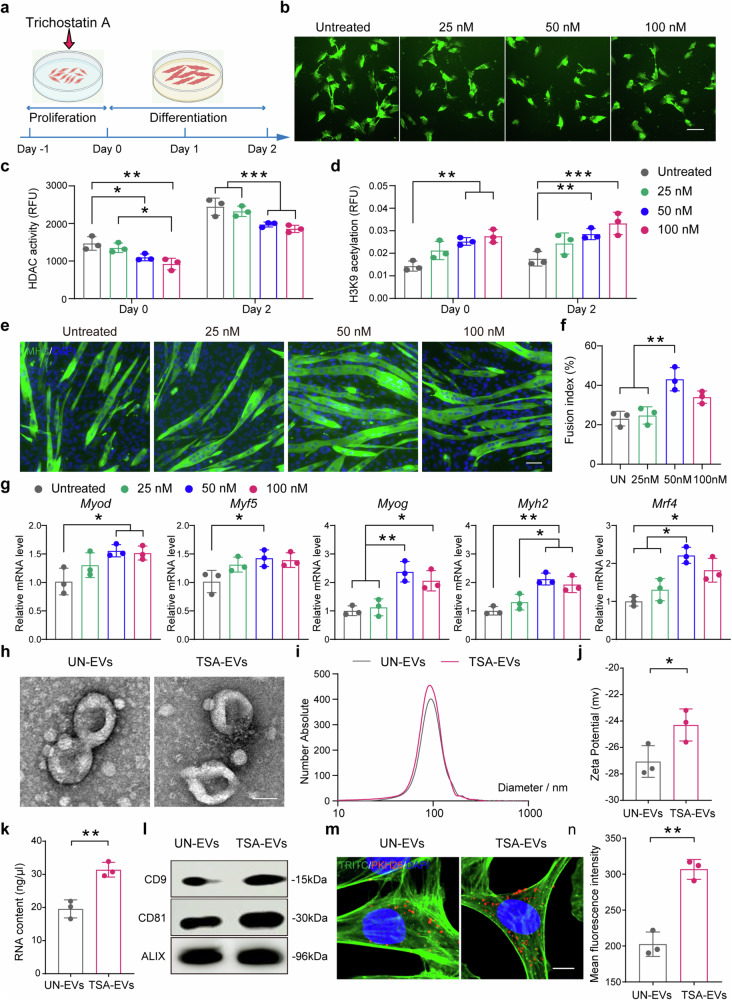 Regular physical activity is widely recognized for reducing the risk of various disorders, with skeletal muscles playing a key role by releasing biomolecules that benefit multiple organs and tissues. However, many individuals, particularly the elderly and those with clinical conditions, are unable to engage in physical exercise, necessitating alternative strategies to stimulate muscle cells to secrete beneficial biomolecules. Histone acetylation and deacetylation significantly influence exercise-induced gene expression, suggesting that targeting histone deacetylases (HDACs) could mimic some exercise responses. In this study, we explored the effects of the HDAC inhibitor Trichostatin A (TSA) on human skeletal muscle myoblasts (HSMMs). Our findings showed that TSA-induced hyperacetylation enhanced myotube fusion and increased the secretion of extracellular vesicles (EVs) enriched with miR-873-3p. These TSA-EVs promoted osteogenic differentiation in human bone marrow mesenchymal stem cells (hBMSCs) by targeting H2 calponin (CNN2). In vivo, systemic administration of TSA-EVs to osteoporosis mice resulted in significant improvements in bone mass. Moreover, TSA-EVs mimicked the osteogenic benefits of exercise-induced EVs, suggesting that HDAC inhibition can replicate exercise-induced bone health benefits. These results demonstrate the potential of TSA-induced muscle-derived EVs as a therapeutic strategy to enhance bone formation and prevent osteoporosis, particularly for individuals unable to exercise. Given the FDA-approved status of various HDAC inhibitors, this approach holds significant promise for rapid clinical translation in osteoporosis treatment.