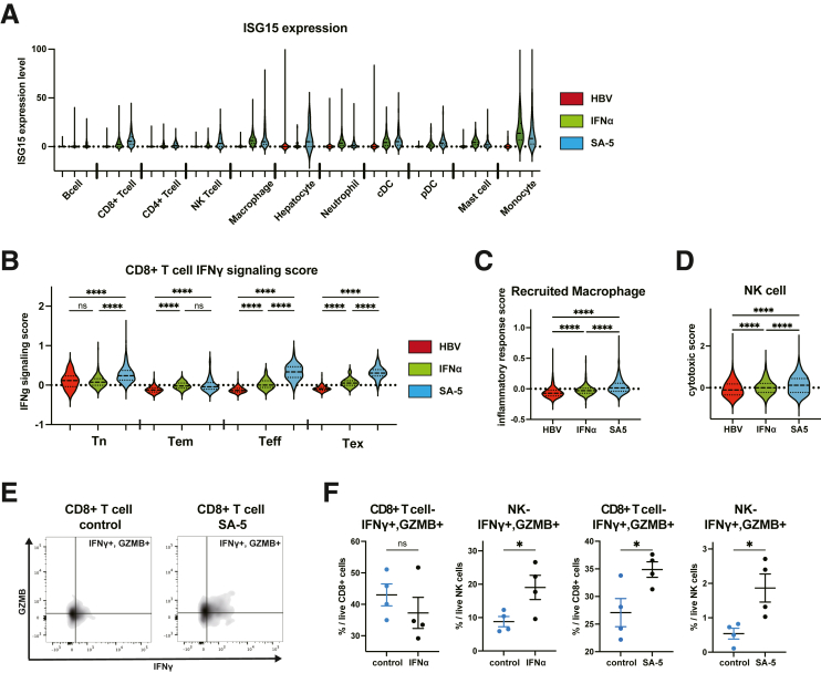 Results: CHB mice exhibited sustained HBV viremia and persistent hepatitis. They showed intrahepatic expansion of exhausted CD8+ T (Tex) cells, the frequency of which was positively associated with viral load. Recruited macrophages increased in number but impaired inflammatory responses in the liver. The cytotoxicity of mature natural killer (NK) cells also increased in CHB mice. IFNα and SA-5 treatment both resulted in viral suppression with mild hepatic flares in CHB mice. Although both treatments activated NK cells, SA-5 had the capacity to revitalize the impaired function of Tex cells and liver-recruited macrophages.
