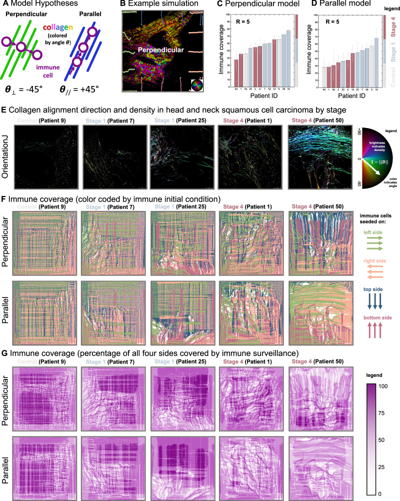 Direct observation of tumor-immune interactions is unlikely in tumors with currently available technology, but computational simulations based on clinical data can provide insight to test hypotheses. It is hypothesized that patterns of collagen evolve as a mechanism of immune escape, but the exact nature of immune-collagen interactions is poorly understood. Spatial data quantifying collagen fiber alignment in squamous cell carcinomas indicates that late-stage disease is associated with highly aligned fibers. Our computational modeling framework discriminates between two hypotheses: immune cell migration that moves (1) parallel or (2) perpendicular to collagen fiber orientation. The modeling recapitulates immune-extracellular matrix interactions where collagen patterns provide immune protection, leading to an emergent inverse relationship between disease stage and immune coverage. Here, computational modeling provides important mechanistic insights by defining a kernel cell-cell interaction function that considers a spectrum of local (cell-scale) to global (tumor-scale) spatial interactions. Short-range interaction kernels provide a mechanism for tumor cell survival under conditions with strong Allee effects, while asymmetric tumor-immune interaction kernels lead to poor immune response. Thus, the length scale of tumor-immune interaction kernels drives tumor growth and infiltration.