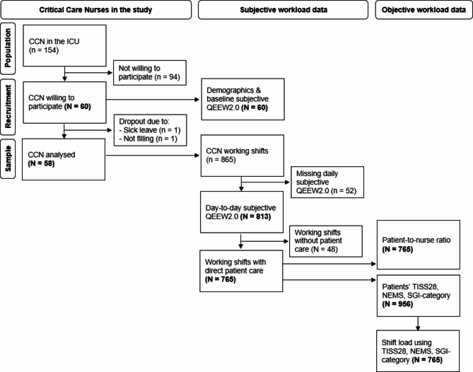 Critical care nurses have high workloads due to the severity of the disease and the complexity of the treatment and care. Understanding the factors that influence subjective workload as well as the association between subjective and objective workload could lead to new insights to reduce critical care nurses' workload. (1) To describe critical care nurses' subjective and objective workload per shift in a university-affiliated interdisciplinary adult intensive care unit in Switzerland and (2) to explore the association between objective and subjective workload. The study used a prospective longitudinal cohort design. Critical care nurses completed the adapted Questionnaire on the Experience and Evaluation of Work 2.0 (QEEW2.0) to assess the subjective workload after every shift for four weeks (0 = never loaded, 100 = always loaded). The objective workload was assessed with the Therapeutic Intervention Scoring System-28 (TISS-28), Nine Equivalents of Nursing Manpower Use Score (NEMS), Swiss Society for Intensive Care Medicine (SGI)-patients' categories and Patient-to-Nurse Ratio (PNR). Data was analysed using multilevel mixed models. The workload of 60 critical care nurses with a total of 765 shifts were analysed. The critical care nurses experienced a subjective high mental load (66 ± 26), moderate pace and amount of work (30 ± 25) and physical load (33 ± 25), and low emotional-moral load (26 ± 22). The one-time baseline subjective workload values were higher than the day-to-day values. The mean objective shift load using the TISS-28 was 43 ± 16 points, the NEMS 36 ± 14 points, the SGI-category 1.1 ± 0.5 nurses needed per patient and the PNR 1.2 ± 0.4. We found positive associations between day-to-day objective variables with subjective pace and amount of work, with physical and mental load but not with emotional-moral load and performance. Measured objective workload is associated with only certain subjective workload domains. To promote and retain critical care nurses in the profession, nursing management should give a high priority to understanding subjective workload and strategies for reducing it.