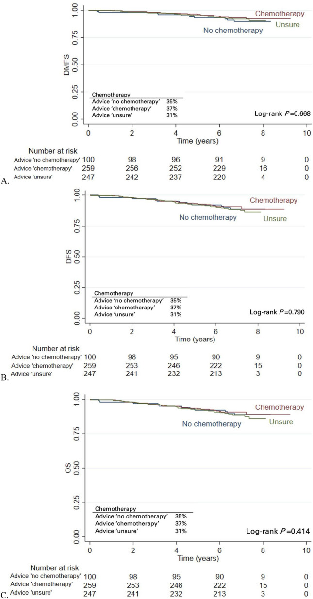 Results: After a median follow-up of 7 years, distant metastases were diagnosed in 23 of the 606 patients (3.8%) and 36 (5.9%) patients had died. The DMFS rate for the 357 70-GS genomic low-risk patients was 94.2% (95% CI 91.2-96.2) and 89.1% for the 249 genomic high-risk patients (95% CI 84.3-92.4). Of the low-risk patients 3% had received chemotherapy compared to 80% of the high-risk patients. For the subgroups based on the pre-test oncologists' advice (no chemotherapy/chemotherapy/unsure) there were no clinically relevant differences in DMFS (89.8, 93.2 and 92.0%, respectively), while comparable proportions of patients had received chemotherapy.