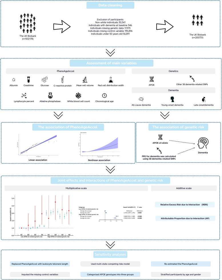 Methods: We included 200,731 participants in the UK biobank. Nine clinical blood biomarkers and chronological age were used to calculate Phenotypic age acceleration (PhenoAgeAccel), which is a novel indicator for accelerated biological aging. The associations of PhenoAgeAccel with dementia, both young-onset and late-onset dementia, were assessed by Cox proportional hazard models. Apolipoprotein E (APOE) alleles and polygenic risk scores (PRS) were used to evaluate the genetic risk of dementia. The interactions between genetic susceptibility and biological aging were tested on both multiplicative and additive scales.