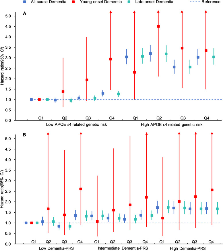 Results: These findings showed individuals who were in the highest quartile of PhenoAgeAccel had a higher risk with incidence of dementia compared to individuals in the lowest quartile of PhenoAgeAccel (HR: 1.145 (95% CI: 1.050, 1.249)). Individuals with biologically older had a higher risk of dementia than individuals with biologically younger (HR: 1.069 (95% CI: 1.004, 1.138)). Furthermore, compared to individuals with biologically younger and low APOE ε4-related genetic risk, individuals with biologically younger and high APOE ε4-related genetic risk (HR:3.048 (95% CI: 2.811, 3.305)) had a higher risk of dementia than individuals with biologically older and high APOE ε4-related genetic risk (HR: 2.765 (95% CI: 2.523, 3.029)). Meanwhile, referring to low dementia PRS and biologically younger, the risk of dementia increased by 72.7% (HR: 1.727 (95% CI: 1.538, 1.939) in the biologically younger and high PRS group and 58.7% (HR: 1.587 (95% CI: 1.404, 1.793) in the biologically older and high PRS group, respectively. The negative interactions between PhenoAgeAccel with APOE ε4 and PRS were also tested on the additive scale.