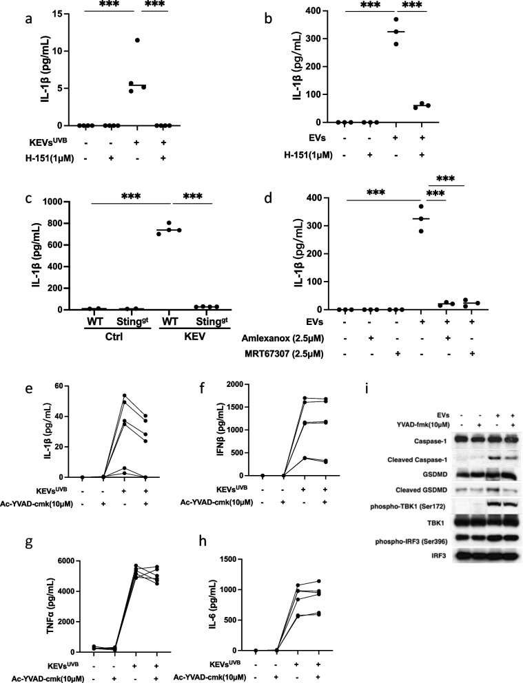 Results: UVB-irradiated keratinocytes produce an increased number of EVs that contain higher concentrations of DNA and protein compared with controls. KC-derived EVs (KEVs) induced a STING- and inflammasome-mediated proinflammatory response in macrophages in vitro, and a pronounced inflammatory infiltrate in mouse dermis in vivo. Melatonin ameliorated KEVs inflammatory effect both in vitro and in vivo.