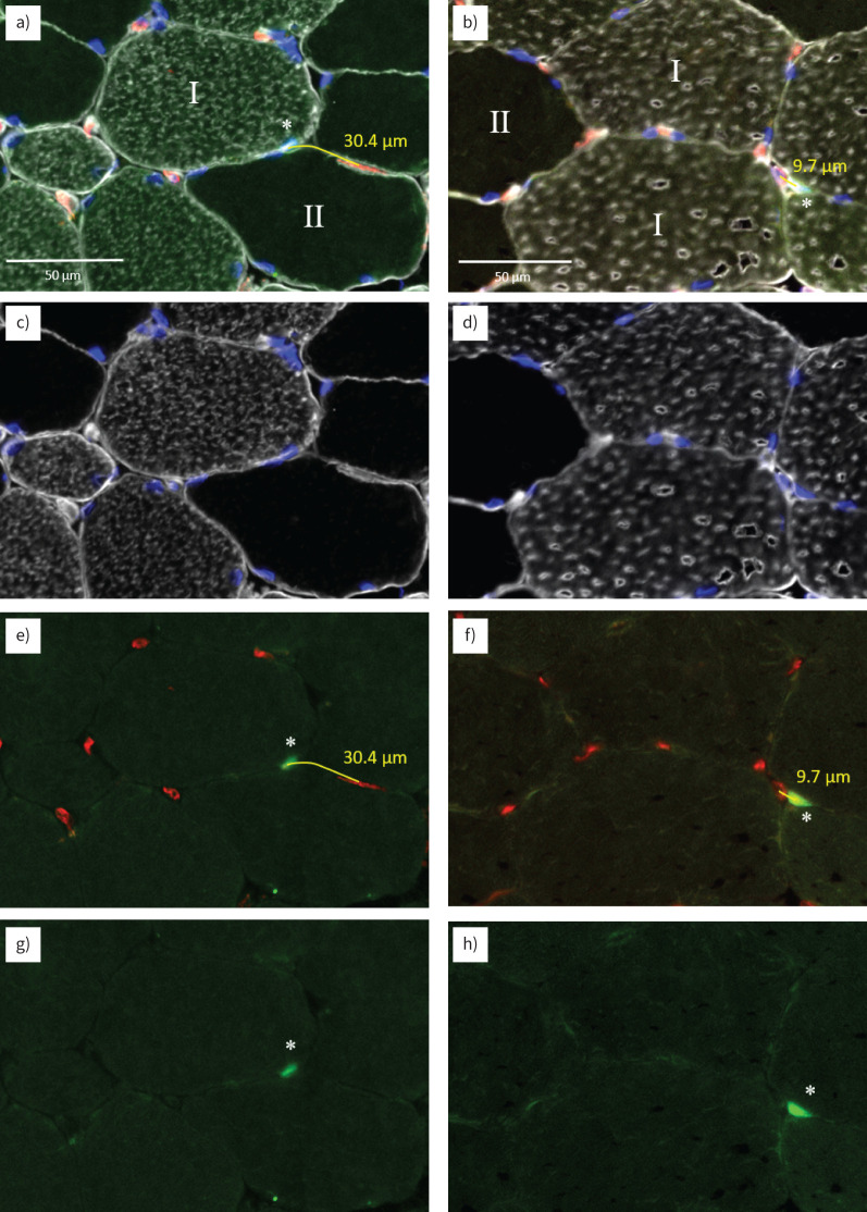 Methods: Muscle biopsies were obtained from the vastus lateralis of n=18 patients with COPD (8 female, 10 male; age 66±5 years, mild-to-severe airflow obstruction) and n=18 age-, sex- and body mass index-matched healthy control adults (8 female, 10 male; age 68±5 years). Immunohistochemistry was used to assess type I/II muscle fibre size, distribution, myonuclear content, satellite cell number and fibre capillarisation. In addition, type I/II muscle fibre satellite cell distance to its nearest capillary was assessed.