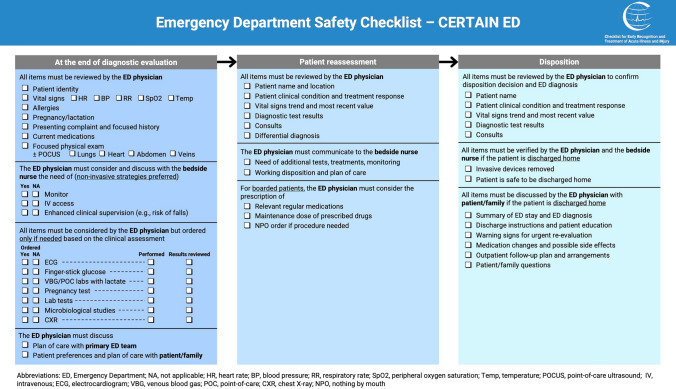 Declarations. Conflict of interest: The authors declare that they have no conflict of interest. Ethical approval, Human and animal rights: This study was performed in line with the principles of the Declaration of Helsinki. The study protocol was reviewed and approved as exempt by the Mayo Clinic Institutional Review Board (IRB n°23–002537; study title “Development of an Emergency Department Safety Checklist to reduce medical errors”; approval date: April 10, 2023). Informed consent: Informed consent to participate in the study was obtained from each panelist prior to the initiation of the Delphi consensus process.