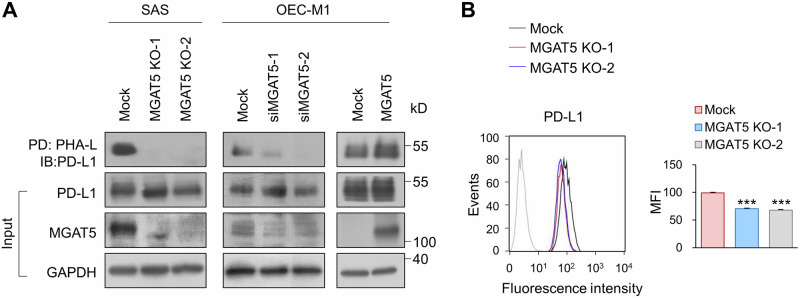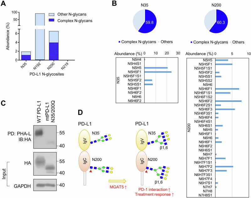 Immunotherapy has revolutionized cancer treatment, but the lack of a reliable predictive biomarker for treatment response remains a challenge. Alpha-1,6-Mannosylglycoprotein 6-β-N-Acetylglucosaminyltransferase 5 (MGAT5) is a key regulator of complex N-glycan synthesis, and its dysregulation is associated with cancer progression. The lectin Phaseolus vulgaris leukoagglutinin (PHA-L) specifically binds to mature MGAT5 products. Previous studies have indicated elevated PHA-L staining in head and neck squamous cell carcinoma (HNSCC), which implies increased activity of MGAT5. However, the specific role of MGAT5 in HNSCC remains unclear. In this study, we found significantly higher PHA-L staining and MGAT5 expression in HNSCC tumors compared to adjacent non-tumor tissues. Using a mass spectrometry (MS)-based glycoproteomic approach, we identified 163 potential protein substrates of MGAT5. Functional analysis revealed that protein substrates of MGAT5 regulated pathways related to T cell proliferation and activation. We further discovered that PD-L1 was among the protein substrates of MGAT5, and the expression of MGAT5 protected tumor cells from cytotoxic T lymphocyte (CTL) killing. Treatment of nivolumab alleviated the protective effects of MGAT5 on CTL activity. Consistently, patients with MGAT5-positive tumors showed improved responses to immunotherapy compared to those with MGAT5-negative tumors. Using purified PD-L1 from HNSCC cells and a glycoproteomic approach, we further deciphered that the N35 and N200 sites carry the majority of complex N-glycans on PD-L1. Our findings highlight the critical role of MGAT5-mediated branched N-glycans on PD-L1 in modulating the interaction with the immune checkpoint receptor PD-1. Consequently, we propose that MGAT5 could serve as a biomarker to predict patients' responses to anti-PD-1 therapy. Furthermore, targeting the branched N-glycans at N35 and N200 of PD-L1 may lead to the development of novel diagnostic and therapeutic approaches.