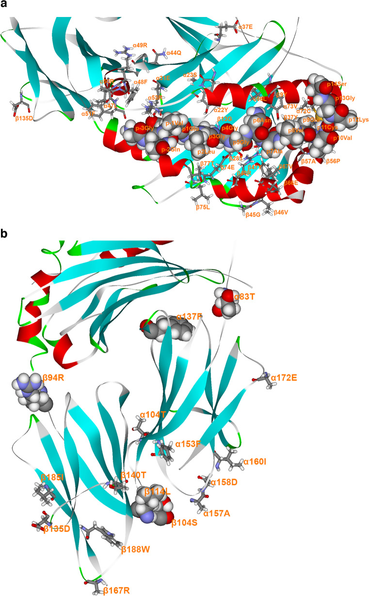 Results: By numerating all possible DQ heterodimers of α- and β-chains, we showed that the heterodimerisation increases genetic diversity at the cellular level from 43 empirically observed haplotypes to 186 possible heterodimers. Heterodimerisation turned several neutral haplotypes (DQ2.2, DQ2.3 and DQ4.4) to risk haplotypes (DQ2.2/2.3-DQ4.4 and DQ4.4-DQ2.2). HOH uncovered eight AAs on the α-chain (-16α, -13α, -6α, α22, α23, α44, α72, α157) and six AAs on the β-chain (-18β, β9, β13, β26, β57, β135) that contributed to the association of DQ with progression of type 1 diabetes. The specific AAs concerned the signal peptide (minus sign, possible linkage to expression levels), pockets 1, 4 and 9 in the antigen-binding groove of the α1β1 domain, and the putative homodimerisation of the αβ heterodimers.