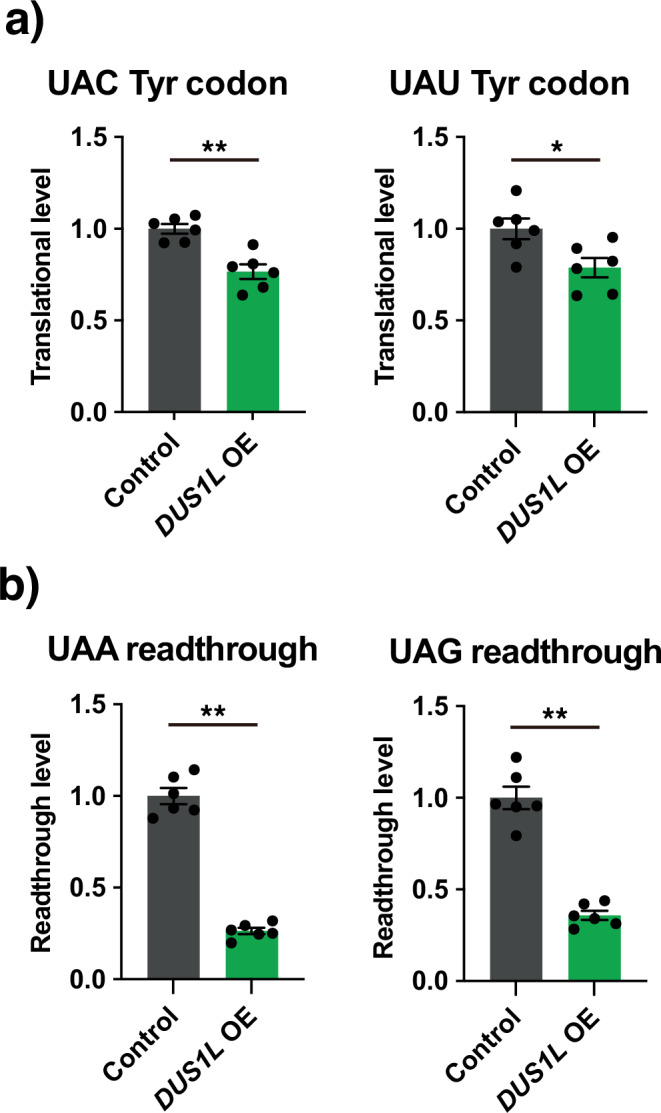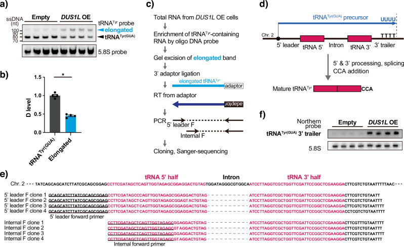Human cytoplasmic tRNAs contain dihydrouridine modifications at positions 16 and 17 (D16/D17). The enzyme responsible for D16/D17 formation and its cellular roles remain elusive. Here, we identify DUS1L as the human tRNA D16/D17 writer. DUS1L knockout in the glioblastoma cell lines LNZ308 and U87 causes loss of D16/D17. D formation is reconstituted in vitro using recombinant DUS1L in the presence of NADPH or NADH. DUS1L knockout/overexpression in LNZ308 cells shows that DUS1L supports cell growth. Moreover, higher DUS1L expression in glioma patients is associated with poorer prognosis. Upon vector-mediated DUS1L overexpression in LNZ308 cells, 5' and 3' processing of precursor tRNATyr(GUA) is inhibited, resulting in a reduced mature tRNATyr(GUA) level, reduced translation of the tyrosine codons UAC and UAU, and reduced translational readthrough of the near-cognate stop codons UAA and UAG. Moreover, DUS1L overexpression increases the amounts of several D16/D17-containing tRNAs and total cellular translation. Our study identifies a human dihydrouridine writer, providing the foundation to study its roles in health and disease.