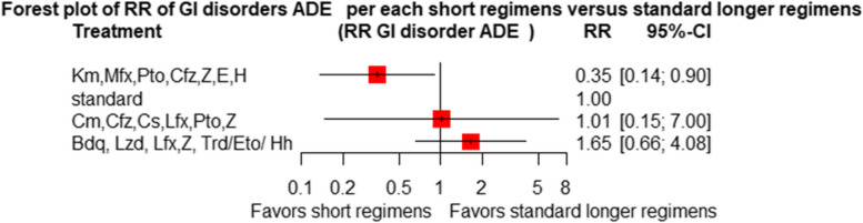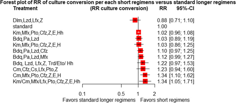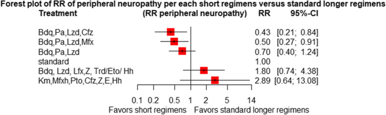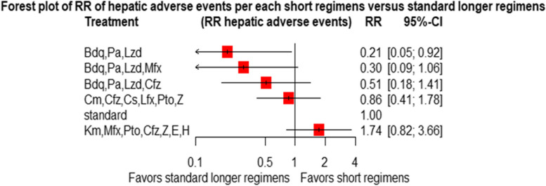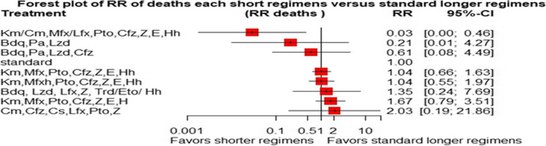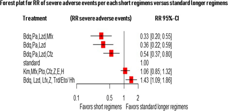 Conclusion: Treatment of patients with RR/MDR-TB using shorter regimens of 6 months BdqLzdLfxZTrd/Eto/H, 9-11 months km/CmMfx/LfxPtoCfzZEHh, and 6 months BdqPaLzdMfx provides significantly higher cure and treatment completion rates compared to the standard longer MDR/RR-TB. However, 6BdqPaLzdMfx, 6BdqPaLzd, and 6BdqPaLzdCfz short regimens are significantly associated with decreased severity of adverse events. The findings are in support of the current WHO-recommended 6-month shorter regimens.
