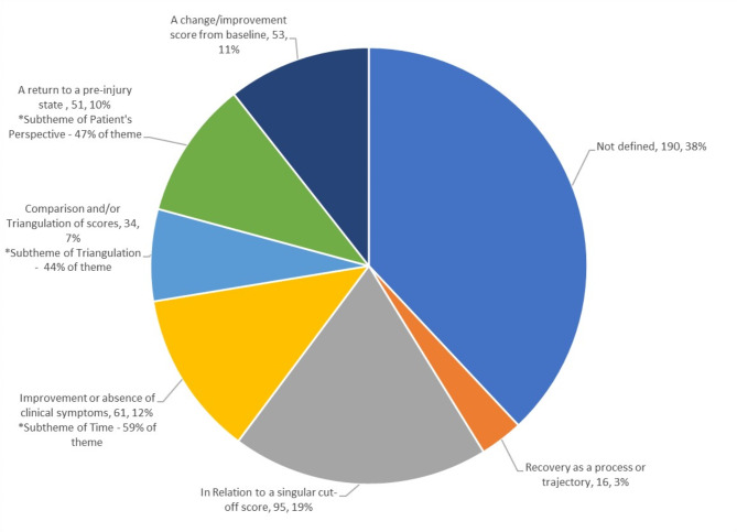 Results: 466 original studies were included: 12 qualitative studies, 88 quantitative randomized control trials, 348 quantitative non-randomized studies, 16 quantitative descriptive studies, and two mixed methods studies. Most of the time recovery was not defined, with six other themes identified: comparison of scores, in relation to a singular cut-off score, improvement of absence of clinical symptoms, a return to a pre-injury state, change/improvement score from baseline and as a process/trajectory. For recovery measurements, six themes described the data: multiple measures, single measure excluding recovery, a recovery measure, recovery and an additional measure, pain and an additional measure, or indirect/ not specified. Lastly recovery perspectives were made from either the patient, provider, or a combination of patient and provider.