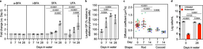 a Fold change of the relative abundance of anteiso-branched (a-BFA), iso-branched (i-BFA), saturated (SFA) and unsaturated (UFA) fatty acids extracted from Lm EGDe in mineral water at the indicated timepoints relative to the first timepoint (day 0). Fold change calculated from data in Supplementary Fig. 5. b Laurdan generalized polarization (GP) of Lm EGDe in mineral water. Increasing relative GP values suggest reduction of the bacterial membrane fluidity. c Membrane fluidity of Lm EGDe in mineral water. Nile red-stained rod-shaped or coccoid cells were analyzed by total internal reflection fluorescence correlation spectroscopy (TIR-FCS) to determine the membrane-associated dye diffusion coefficient. Each dot represents one measured bacterium, and dots with same color represent bacteria measured from the same suspension. d Total cell numbers of Lm EGDe in mineral water were quantified by flow cytometry in samples treated (red) or not (gray) with mutanolysin. Data are expressed as mean ± standard deviation (a, b, d) or median + interquartile range (c) of three independently prepared bacterial suspensions (white circles in bar plots, differentially colored dots in scatter plot). Statistical significance was determined with two-way ANOVA with Tukey’s (a) or Šidák’s test (d), and one-way ANOVA with Dunnett’s (b) or Tukey’s (c) tests. Source data are provided as a Source Data file.
